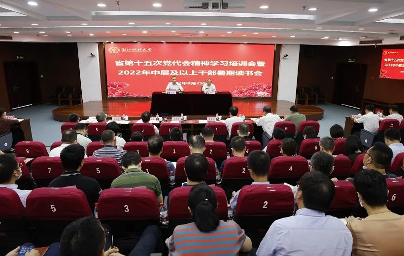 本网讯 8月29日至30日,学校召开省第十五次党代会精神学习培训会暨2022年中层及以上干部暑期读书会。本次会议的主题是“深入学习习近平总书记在省部级主要领导干部专题研讨班上的重要讲话精神,贯彻落实省第十五次党代会精神,推动学校第二次党代会决策部署和‘十四五’发展规划目标任务落地落实落细。”校领导班子成员、全体中层干部参加理论学习会。