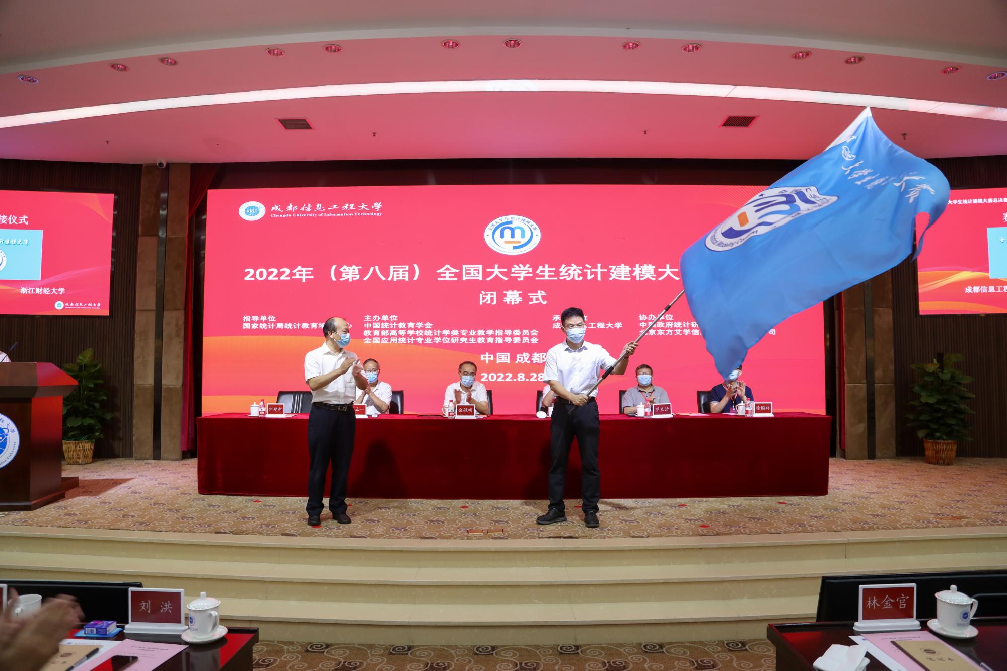 本网讯 近日,第八届全国大学生统计建模大赛总决赛在成都落下帷幕。校党委委员、副校长董进才出席闭幕式并代表学校接过下一届比赛赛旗。经过激烈角逐,学校入围总决赛的3支队伍均获得一等奖的优异成绩,其中本科生组荣获全国一等奖1项、研究生组荣获全国一等奖2项。