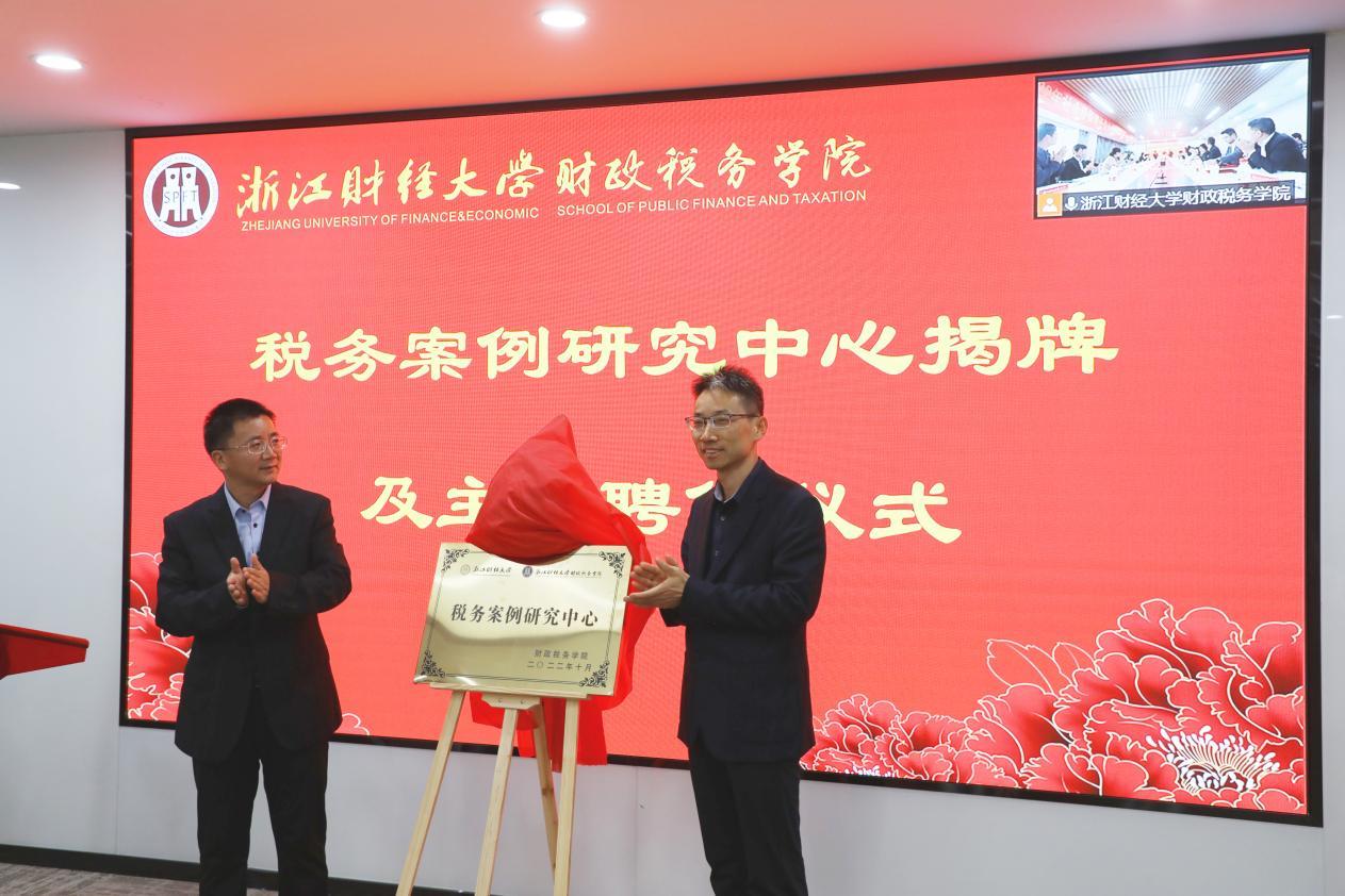 校学术委员会副主任李永友和财政税务学院院长司言武共同为税务案例研究中心揭牌