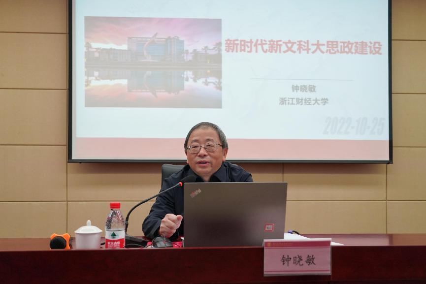 钟晓敏结合党的二十大报告,围绕“大思政理念”“大思政建设基本思路”“课程思政建设”等方面,深度解析了“新时代·新文科·大思政”的根本立意和深刻内涵。他还以《财政学》课程为例,展现了如何深入挖掘课程思政元素,建设充实、生动、有效的课程思政课堂教学。钟晓敏指出,“思政课程”和“课程思政”是高校培根铸魂的两大重要抓手,思政课是落实立德树人根本任务的关键性课程,课程思政是实践高校大思政教育任务下与课程思政协同育人的重要手段。他强调,“育人”先“育德”,要将思政元素融入专业知识中,实现显性教育和隐性教育的有机融合,以文载道、以文化人、以文育人,实现培养德智体美劳全面发展的社会主义建设者和接班人的教育目标。