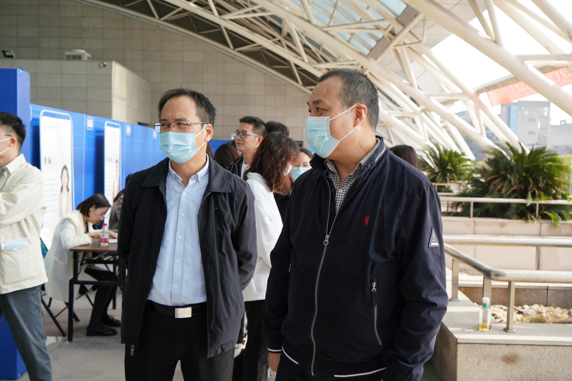 本网讯 11月2日,学校2023届毕业生秋季综合招聘会在下沙校区举行。校党委书记李金昌、党委副书记余建森等深入招聘会现场看望慰问用人单位代表,了解用人需求,并与应聘毕业生亲切交谈。
