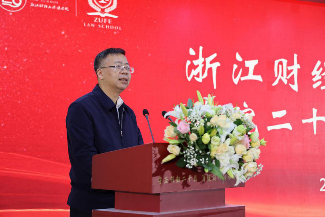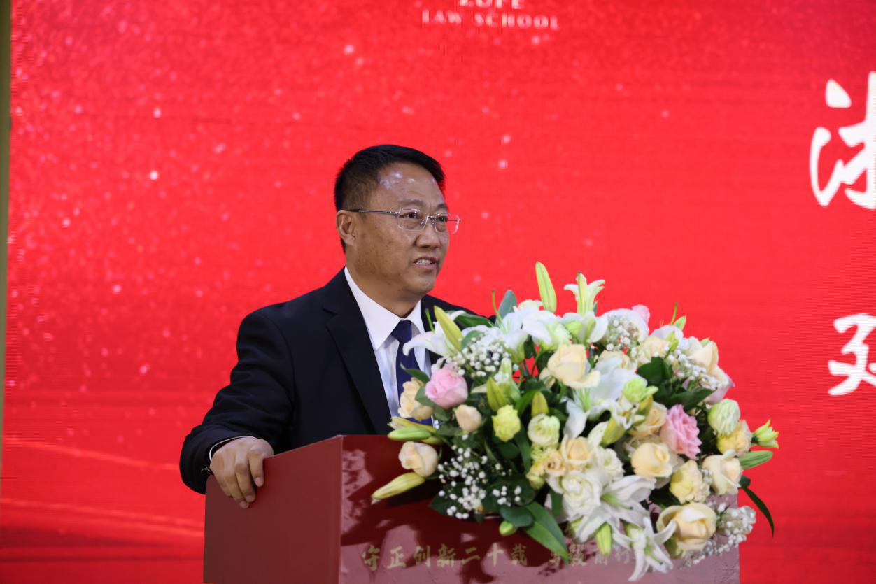 黄建新代表学校对法学院建院20周年表示祝贺,对法学院过去20年取得的各项成绩表示肯定,希望法学院深入学习贯彻党的二十大精神,以建院20周年为契机,坚守初心使命,汲取奋进力量,坚持走内涵式高质量发展道路,继续书写无愧于伟大时代的绚丽篇章。