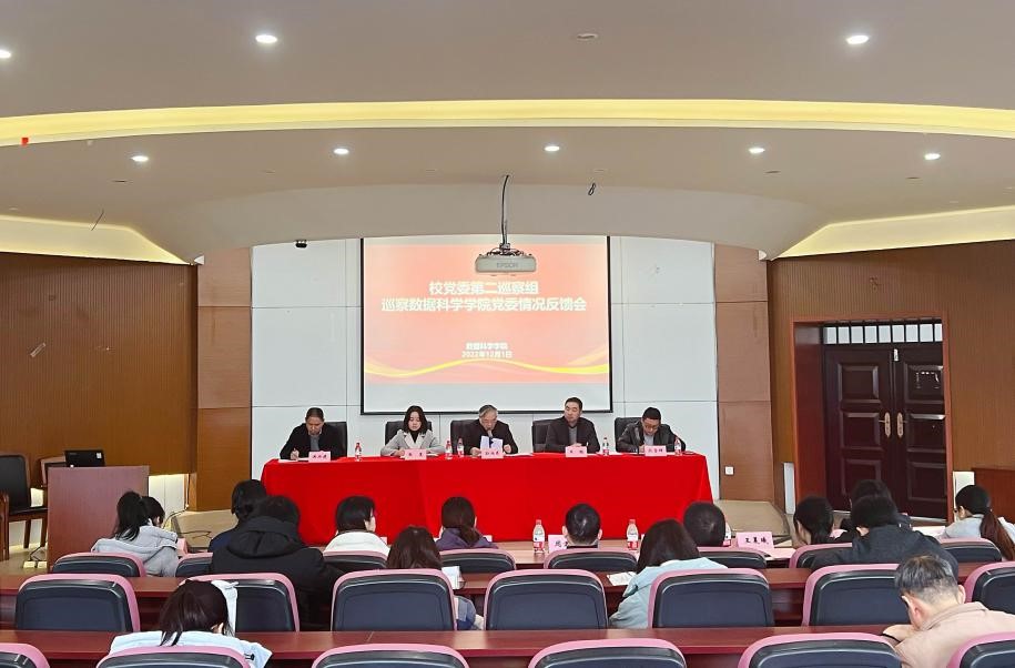 财政税务学院党委书记童玉玲、数据科学学院党委书记段雪辉分别就落实巡察反馈意见作表态发言。财政税务学院和数据科学学院全体教职工、近五年调离或退出领导岗位的原班子成员及学生党支部书记参加会议。
