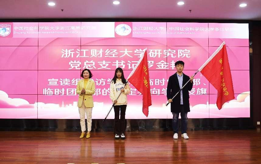 与会领导为获得2021-2022学年专项奖学金学生颁发了荣誉证书。活动现场还宣读了组建“买球体育官方网站研究院党总支赴京访学临时党支部”和“买球体育官方网站研究院团委赴京访学临时团支部”的决定,并向访学学生代表授旗。