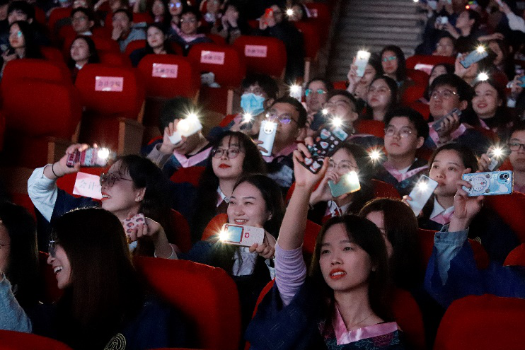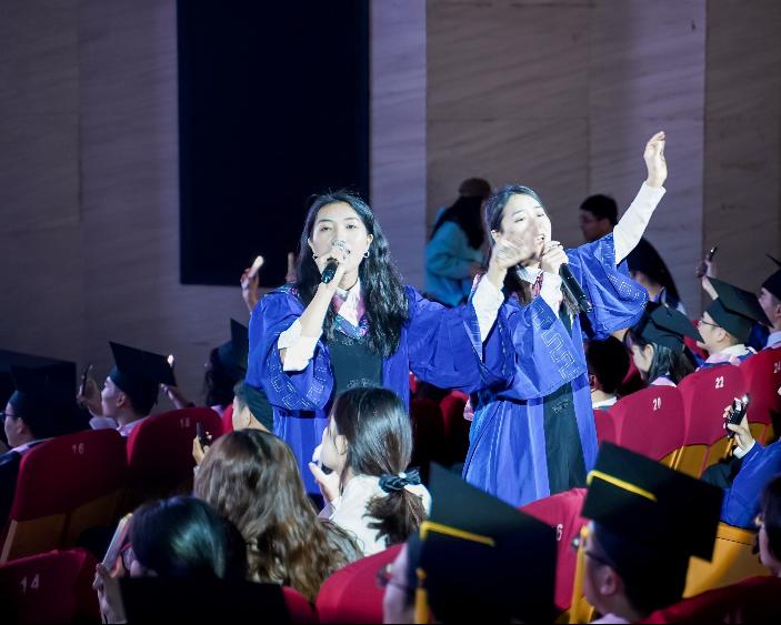 典礼开始前,毕业生以温情的歌声,倾诉在成长中续写的“光阴故事”,寄予即将奔赴远方的“祝福”。大屏幕上绽放的张张笑脸,全场亮起的点点星光,将现场渲染成欢乐的海洋。毕业纪念视频《经年》记录了780位毕业研究生915天的研途点滴与未来憧憬,全体师生一起重拾往昔,气氛温馨而感人。