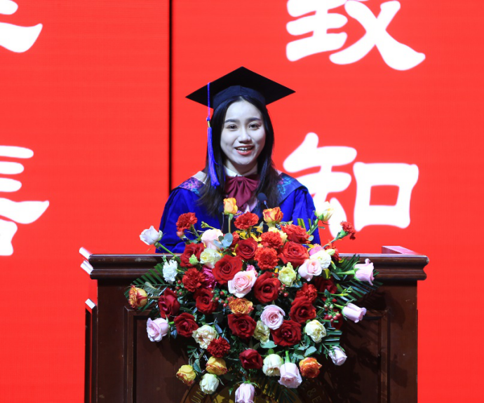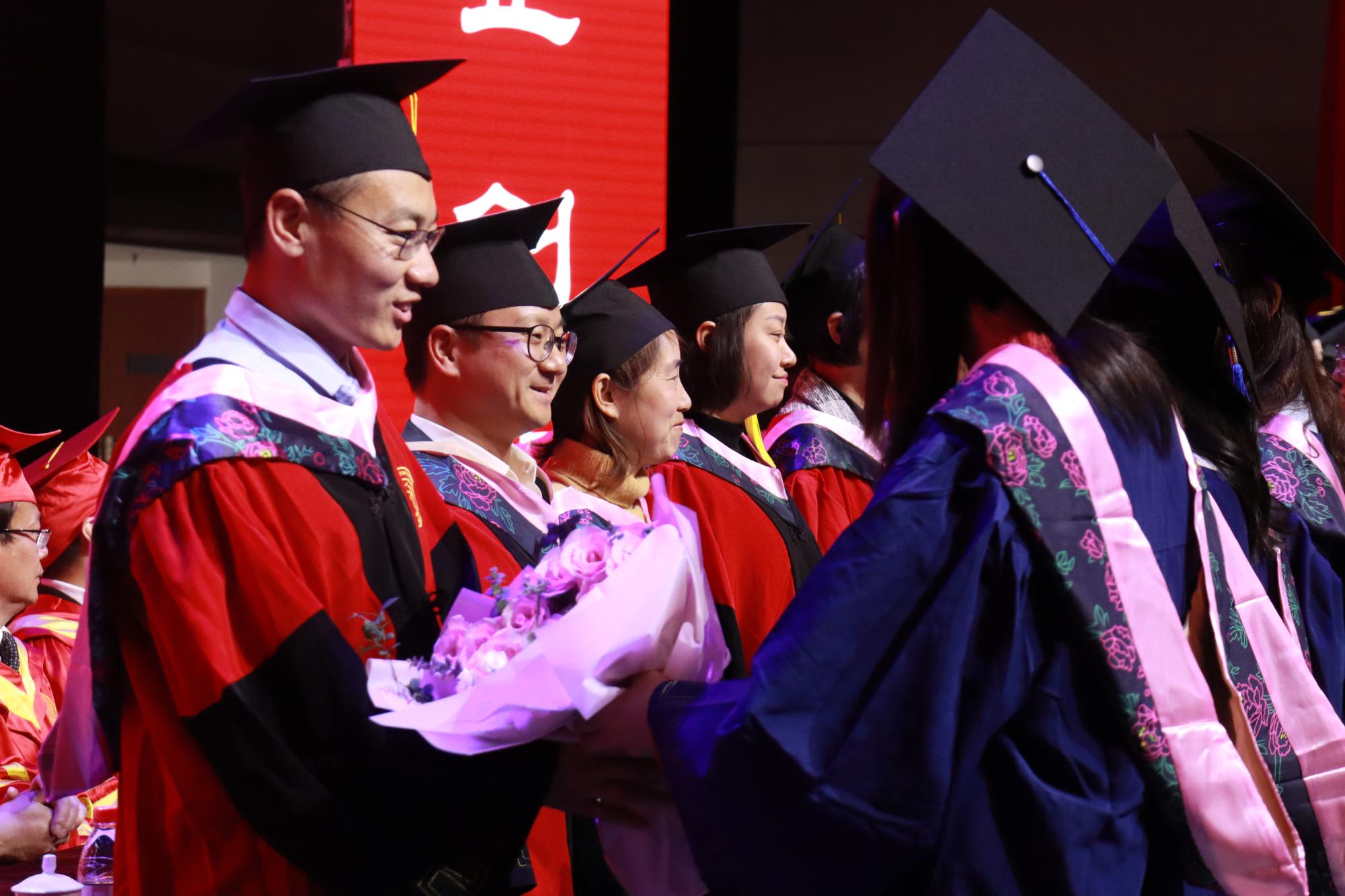 导师代表方军雄教授发言,希望同学们以平和、热情的心态去面对毕业后的工作与生活。毕业生代表林雯洁分享了求学生涯中的所学所感,感谢母校和导师呵护栽培之泽。毕业生代表向导师代表献花,表达学子的感恩与不舍。