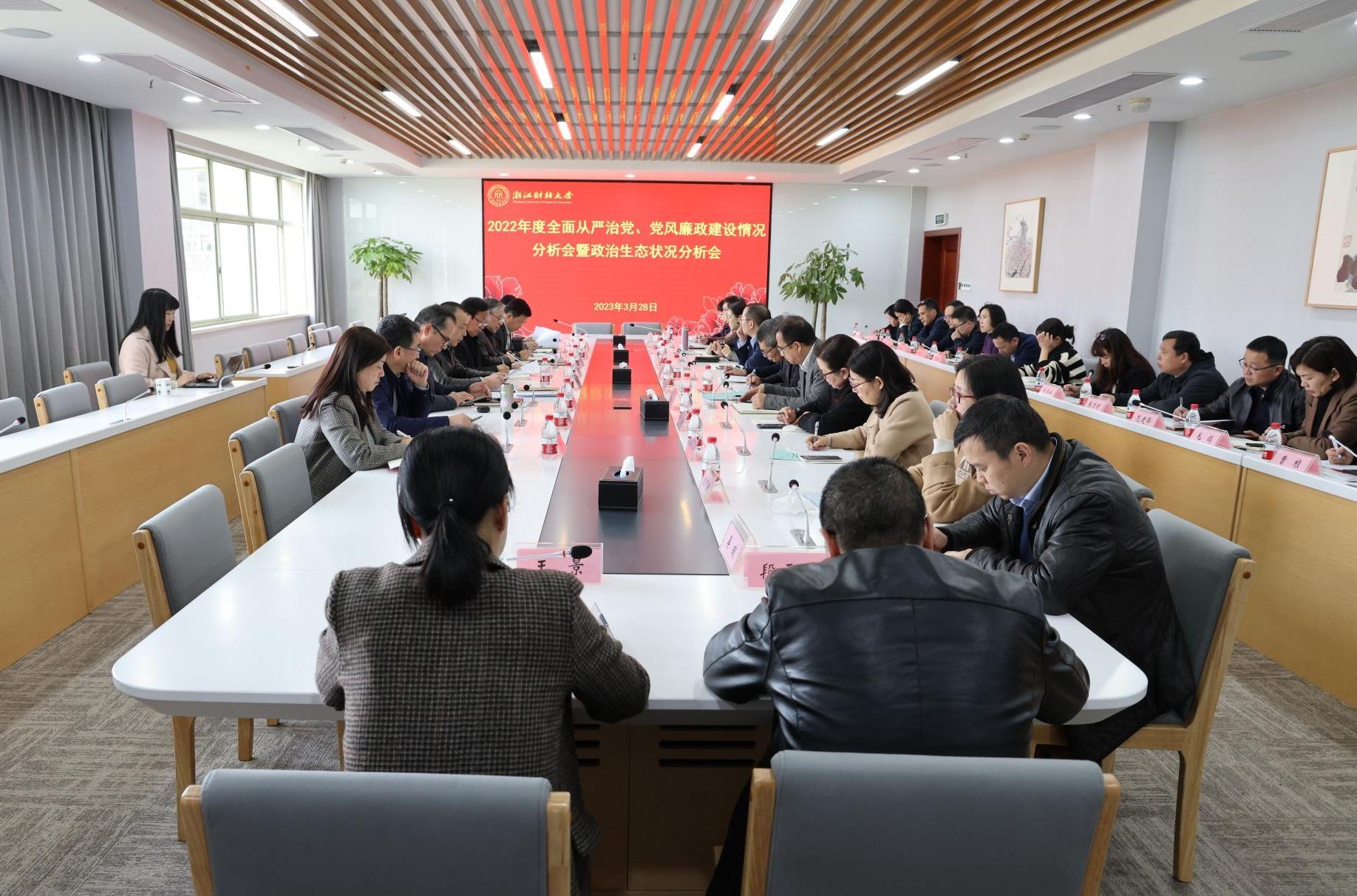 本网讯 3月28日,学校召开2022年度全面从严治党、党风廉政建设情况分析会暨政治生态状况分析会。校领导班子成员、校纪委委员、党群部门主要负责人、各二级党组织书记参加会议。会议由校党委书记李金昌主持。