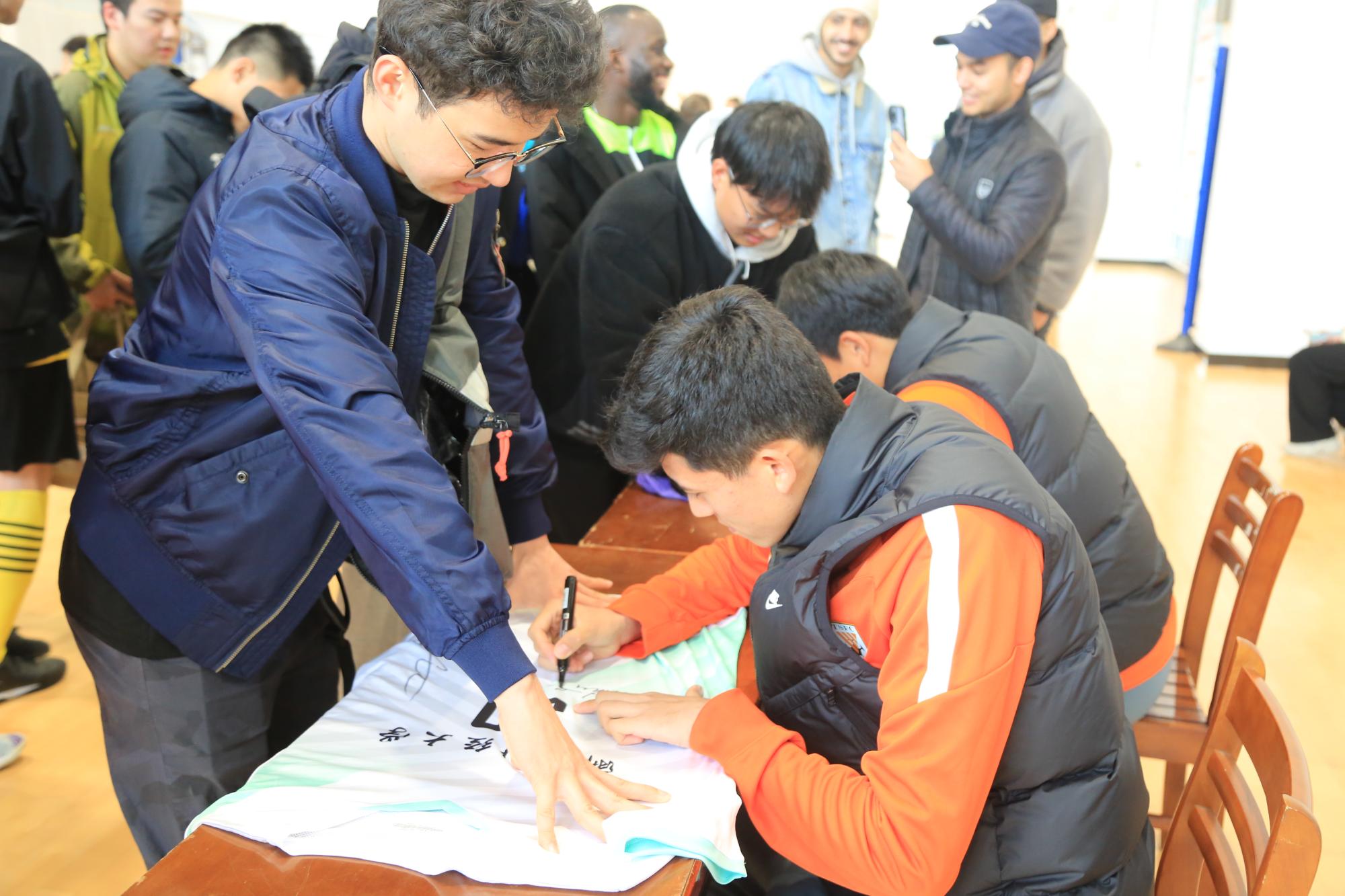 陈哲宣和买吾郎•米吉提作为球员代表为活动送上祝福,并现场展示“中国足协超级杯”冠军奖杯。他们为学校赠送签名球衣和足球,与大学生球迷合影互动,表达对学校大力普及和发展校园足球运动的支持。