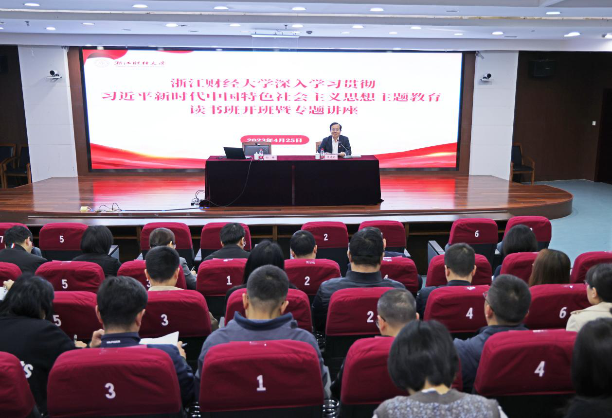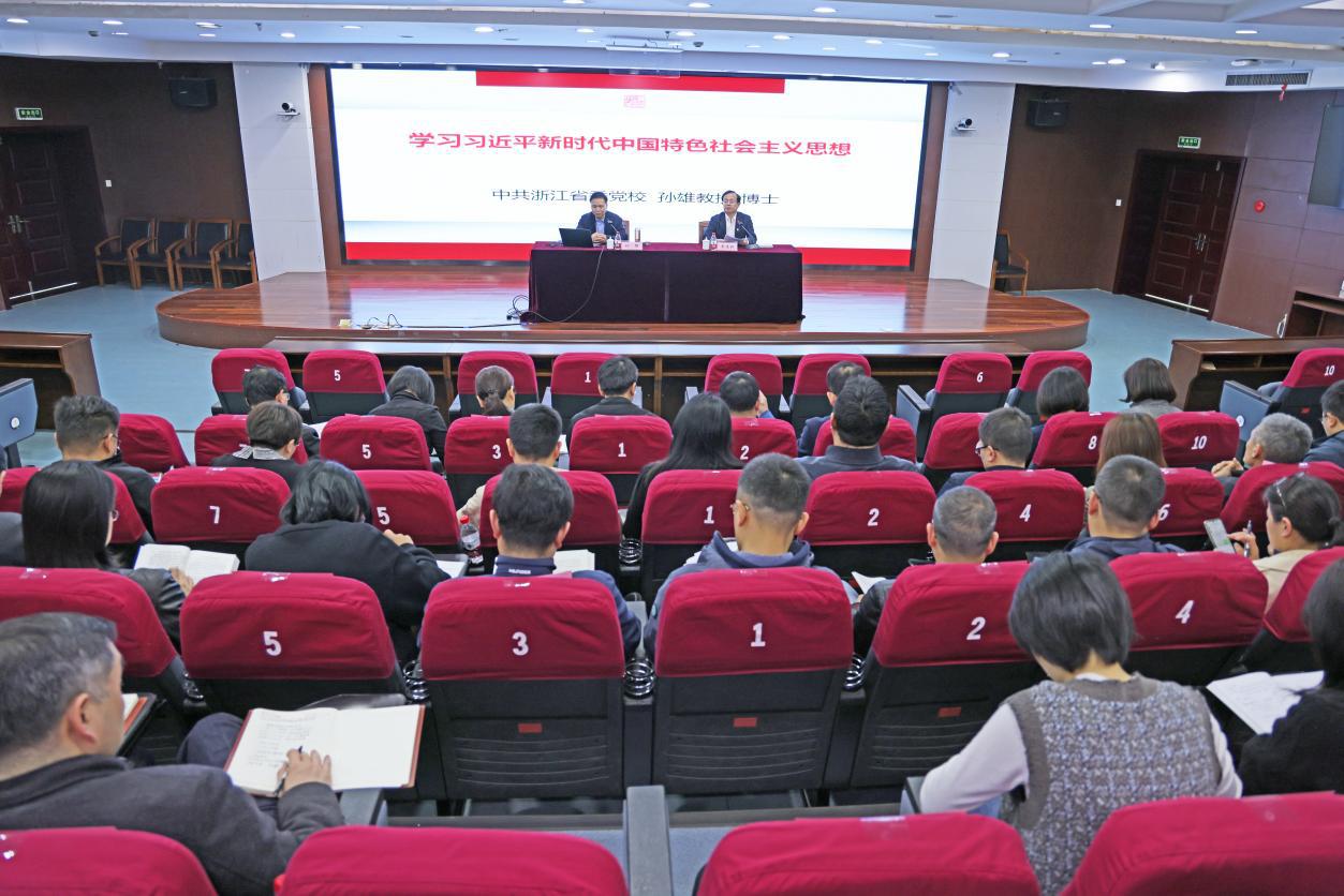 本网讯 4月25日,学校深入开展学习贯彻习近平新时代中国特色社会主义思想主题教育读书班开班仪式暨首场专题报告会在下沙校区举行。中共浙江省委党校孙雄教授作专题报告。校党委副书记、主题教育领导小组副组长黄建新主持开班仪式并讲话。全体中层干部参加学习。