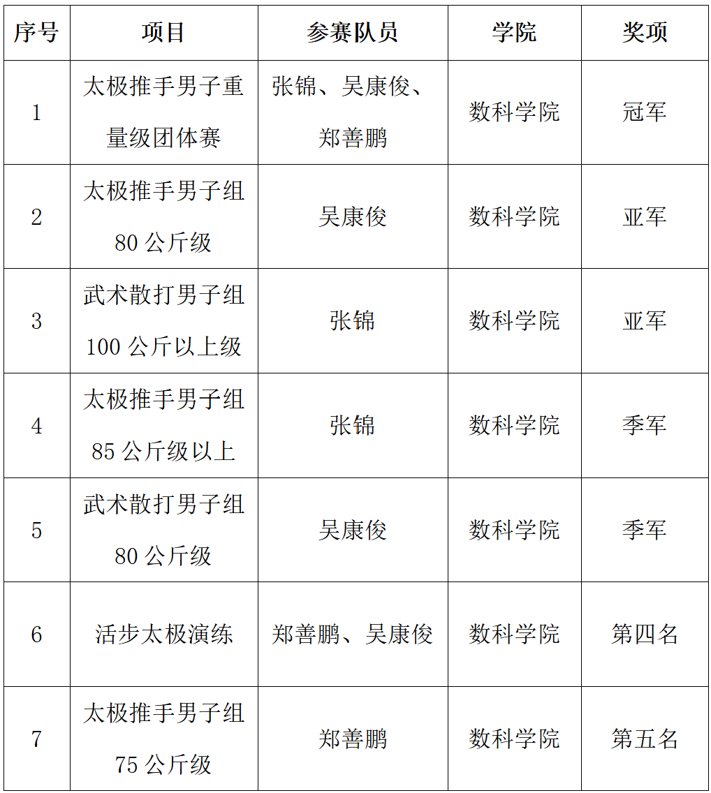 经过11天的激烈角逐,我校运动健儿夺得太极推手男子重量级团体赛冠军、太极推手男子组80公斤级亚军、武术散打男子组100公斤以上亚军、太极推手男子组85公斤级以上季军、武术散打男子组80公斤级季军。同时,学校获得体育道德风尚奖,应昌达老师获“体育道德风尚教练员”,郑善鹏、吴康俊同学获得“体育道德风尚运动员”。