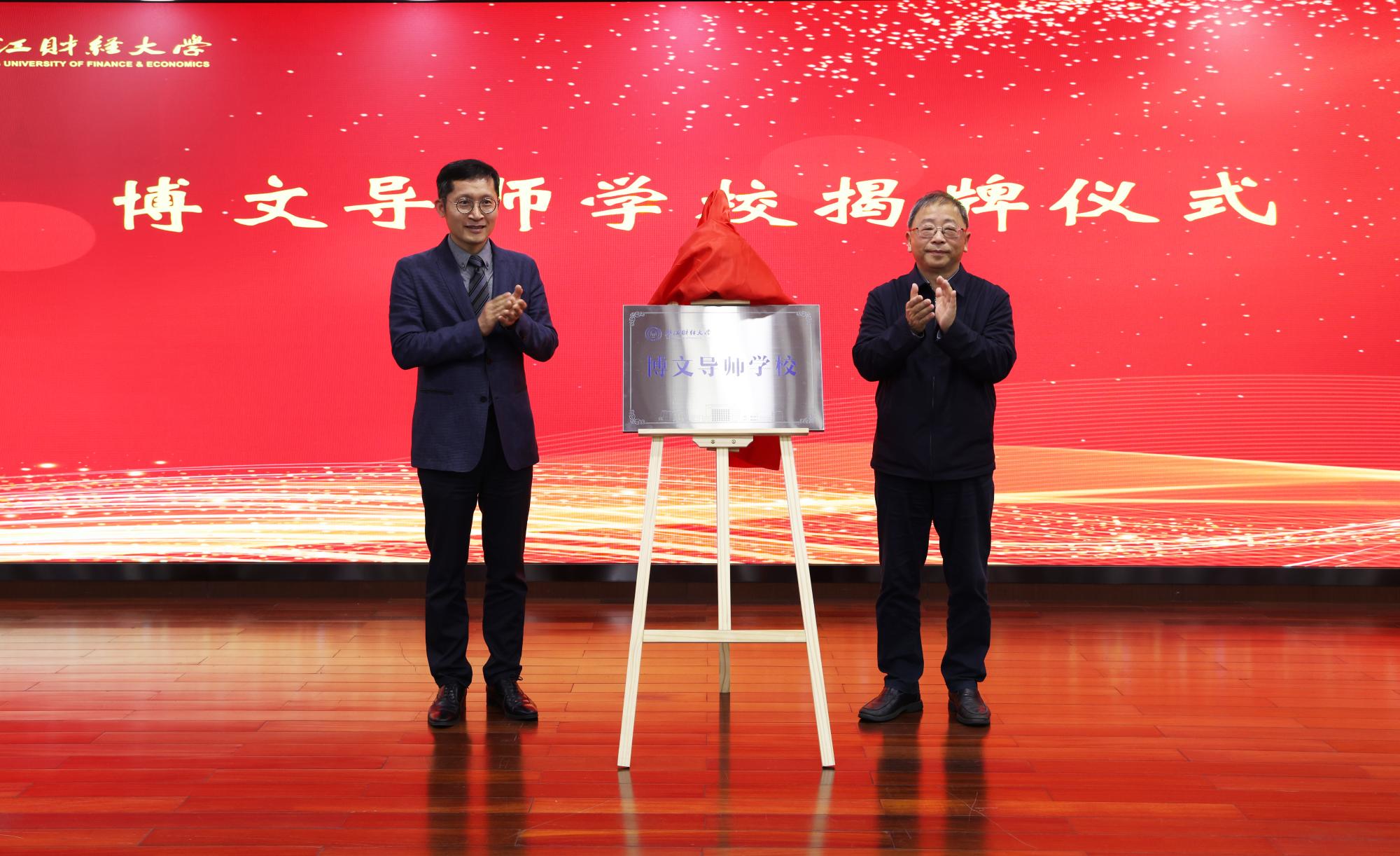 钟晓敏与第三届“卓越研究生导师”荣誉称号获得者、经济学院唐要家教授共同为博文导师学校揭牌。