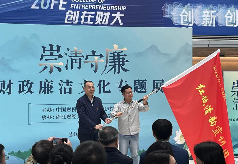 开幕仪式上,李金昌为财政税务学院红鹄清韵宣讲团授旗。