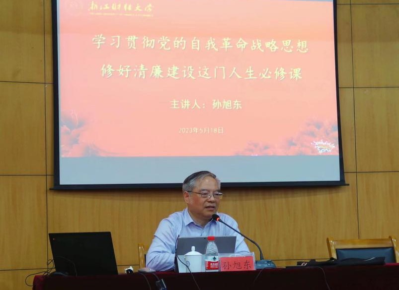 5月18日,党委委员、纪委书记孙旭东以《学习贯彻党的自我革命战略思想 修好清廉建设这门人生必修课》为题,为学校二级纪委书记、计划财务处、各单位财务联络员、纪检监察和巡察干部及部分教师代表讲授专题党课。孙旭东深入宣讲党的十八大以来以习近平同志为核心的党中央坚定不移推进全面从严治党、党风廉政建设和反腐败斗争的坚强意志、重大成就和形势态势,强调党员干部要清醒认识和自觉适应当前党风廉政建设和反腐败斗争的新常态,牢记打铁必须自身硬的道理。他表示,党员干部要把清廉作为自己的生命线、幸福线,增强风险防范意识,巩牢思想道德防线,慎独慎微慎初,敬畏党纪国法,不断提升清廉境界。