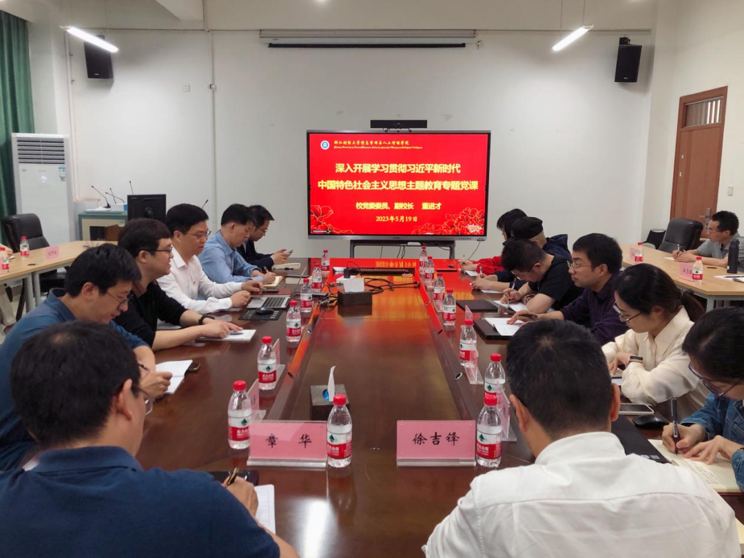 5月19日,党委委员、副校长董进才以《深入学习习近平新时代中国特色社会主义思想》为题,为信智学院讲授专题党课。董进才从习近平新时代中国特色社会主义思想的核心要义与历史方位、世界观和方法论、伟大飞跃、时代意义和世界历史意义等方面,系统阐释了习近平新时代中国特色社会主义思想的科学内涵。他表示,全体党员要把握“两个大局”的历史背景,“十个明确”的核心内容、“十四个坚持”的基本方略、“十三个方面”的历史成就,深刻认识主题教育的意义,按照“学思想、强党性、重实践、建新功”的总要求,将深入开展学习贯彻习近平新时代中国特色社会主义思想主题教育与教学、科研、育人等实际工作相结合,为实现中华民族伟大复兴的中国梦培养更多的社会主义接班人。