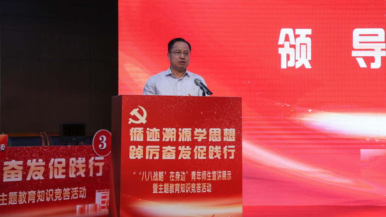 本网讯 循迹溯源学思想,踔厉奋发促践行。为深入推进学习贯彻习近平新时代中国特色社会主义思想主题教育走深走实,强化思想引领和理论武装,5月25日,学校组织开展“‘八八战略’在身边”青年师生宣讲展示暨主题教育知识竞答活动。校党委委员,组织部、宣传部、统战部部长楼胆群出席并致辞。相关职能部门负责人、各参赛队伍所在党组织负责人、各二级党组织师生代表共计500余人参加活动。