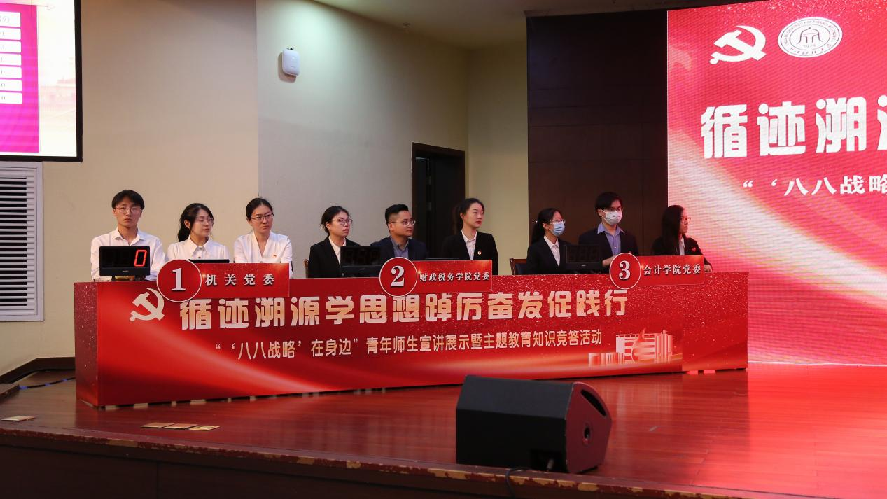 本次知识竞赛的主要内容是习近平新时代中国特色社会主义思想、党的二十大精神、习近平总书记系列重要讲话精神。现场决赛采用积分制,设置必答题、抢答题和论述题3个环节。经过前期选拔,机关党委、财税学院、会计学院、外语学院、人文学院、图书馆六支队伍成功入围决赛。比赛过程中,师生选手们展示了扎实的理论功底和良好的精神风貌,伴随着抢答指令的发出,赛况进入“白热化”。在论述题环节,选手们准备充分、侃侃而谈,充分展示出师生学习习近平新时代中国特色社会主义思想的成果。以“竞”激发学习热情,以“赛”铸牢忠诚信念,严肃活泼、紧张激烈的赛场气氛让主题教育变得更加有“知”有味。