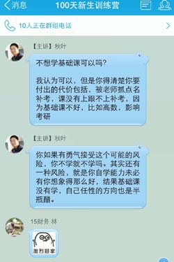 张志老师网名“秋叶”,微博@秋叶26万粉丝,微信秋夜青语超10万大学生关注,他的微信被称为“大学生最值得关注的10个微信之一”。本次分享会的地点有些特别,是在“100天改变自己新生训练营”QQ群中进行,秋叶老师采用文字与语音相结合的方式,为同学们带来了别开生面的重要一课。