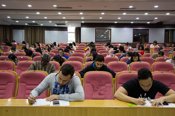 此次外文书法大赛主要是为外文书法爱好者提供一个交流平台,同时也是为了激发同学们对书法的兴趣,提高艺术修养、审美情趣。经过前期遴选,来自13个学院的90余名中外学生参加本次比赛。在现场,他们或用硬笔,或用软笔,分别进行英文、日文、等国文字的书法创作,全心投入,认真严谨。