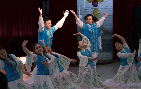 活动现场洋溢着浓浓的节日氛围,演员们身着哈萨克传统民族服饰,时而欢舞、时而歌唱,在冬不拉优美而轻快的乐声中徜徉。一段段优美的舞蹈,一首首动人的歌曲,展示了哈萨克传统文化的魅力。期间,还穿插了摔跤、掰手腕等小游戏,加油声、喝彩声此起彼伏。留学生们还亲手制作了非常丰盛的哈萨克传统美食,大家围坐在一起,边享用美食边观赏节目,其乐融融。