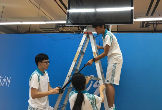 “贵宾室的电视,裁判会议室的电视、投影仪,检录处的两台电视,编排室的打印机和电脑,以及证件组的工作电脑都是我们安装的。”谈到自己的工作,志愿者吴泓杉非常自豪,“虽然一开始没有经验,但在老师的指导下,每次完成电脑的组装都很开心,累点也不算什么了。”