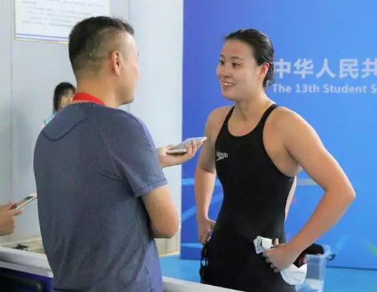 从布达佩斯世锦赛以来,傅园慧一直忙于比赛,谈到体力问题,她说:“比赛密集确实影响体力,但是我觉得体力问题不会影响我赛时的拼搏技能。”虽然是学生运动会的比赛,但傅园慧没有懈怠,决赛做准备动作时,傅园慧习惯性地往身上淋了一瓶水,并用力拍打身体以提高身体的兴奋度。作为一名职业运动员,傅园慧希望参加这次全国学生运动会能把自己坚定、拼搏、永不放弃的精神传递给学生朋友。