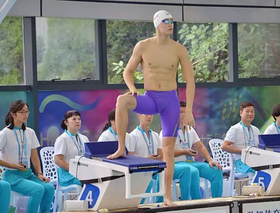 招牌的粉色泳裤,人群中分外明显的1.92米身高,早晨的男子乙组400米自由泳预赛中,孙杨一进入赛场,就引得场内观众和热情粉丝的阵阵欢呼声,场馆气氛被瞬间点燃,整个场馆都发出了为孙杨加油的声音,而坐在北区观众席的观众更是激动非常,他们聚在一处,手持孙杨的灯牌和手幅,为孙杨加油助威,“孙杨加油!”、“杨哥最帅!”……正向裁判鞠躬致意的孙杨转过头辨清了声音来源,也朝观众席笑着挥了挥手,才开始他入水前的准备动作。