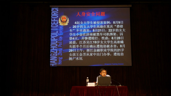 余警官以近两年来全国各地包括下沙高教园区发生的多起杀人、抢劫、强奸等恶性案件为例,对暴力型侵害、胁迫型侵害、社会型侵害、诱惑型侵害、滋扰型侵害和网恋型侵害6种人身侵害的主要形式进行了详细阐述,并告诫同学们平时要有防范意识,保持良好的防护习惯;留心观察身边的人和事,及时规避可能针对自己的侵害;发生案件、发现危险要快速、准确、实事求是地报警求助;用法律手段维护自身的人身安全。