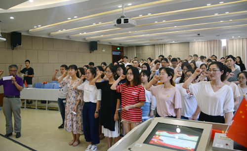 “我志愿加入中国共产党,拥护党的纲领,遵守党的章程,履行党员义务,执行党的决定……”全体师生党员面对鲜红的党旗,高举右拳,庄严宣誓,通过重温入党誓词的方式来表达对建党97周年的纪念。