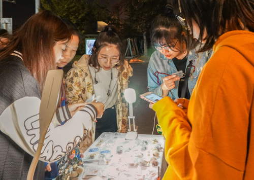 不同的商铺由水星、金星、地球等八大行星命名成不同的站点。同学们三三两两,有说有笑,在各大行星站间穿梭,一个个小商铺前挤满了人。手链耳饰、拖鞋玩偶,电子产品、零食周边……各式各样的商品琳琅满目,让人应接不暇。