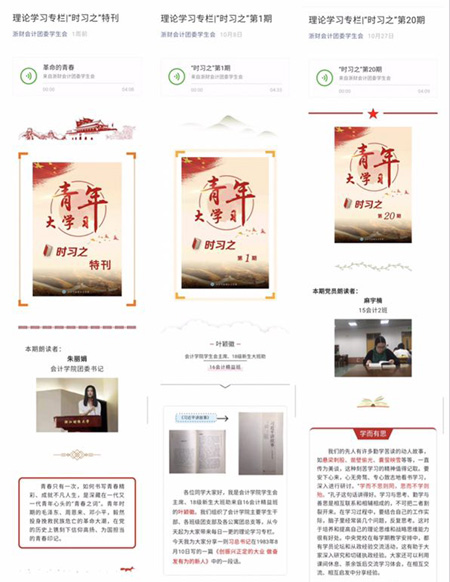 “时习之”线上活动以诵读习近平总书记重要论述为主,以微信推送为载体,并以“朗读者”的方式,引导学生时时学习党的最新理论成果,宣传党的十九大精神。